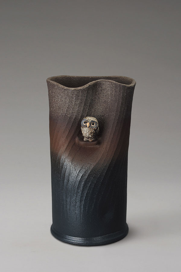 シンプルな信楽焼の傘立てにワンポイントのふくろうが玄関を明るくしてくれます♪